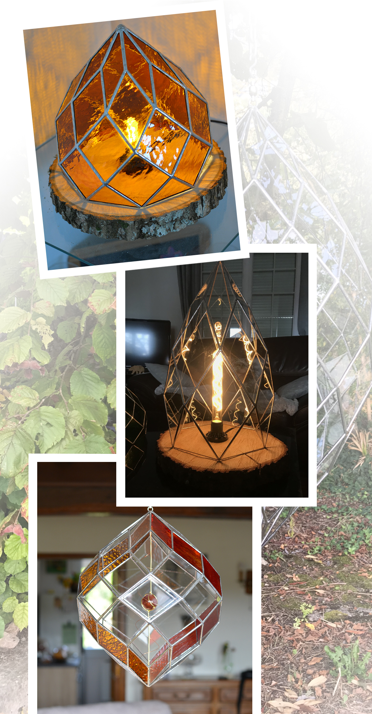 Réalisation de vitrail 3D à partir de la technique Tiffany. Les objets principaux réalisés sont des zomes, dans lampes et autres solides de platon. L’élaboration de ces formes sont calculées majoritairement en géométrie sacrée.